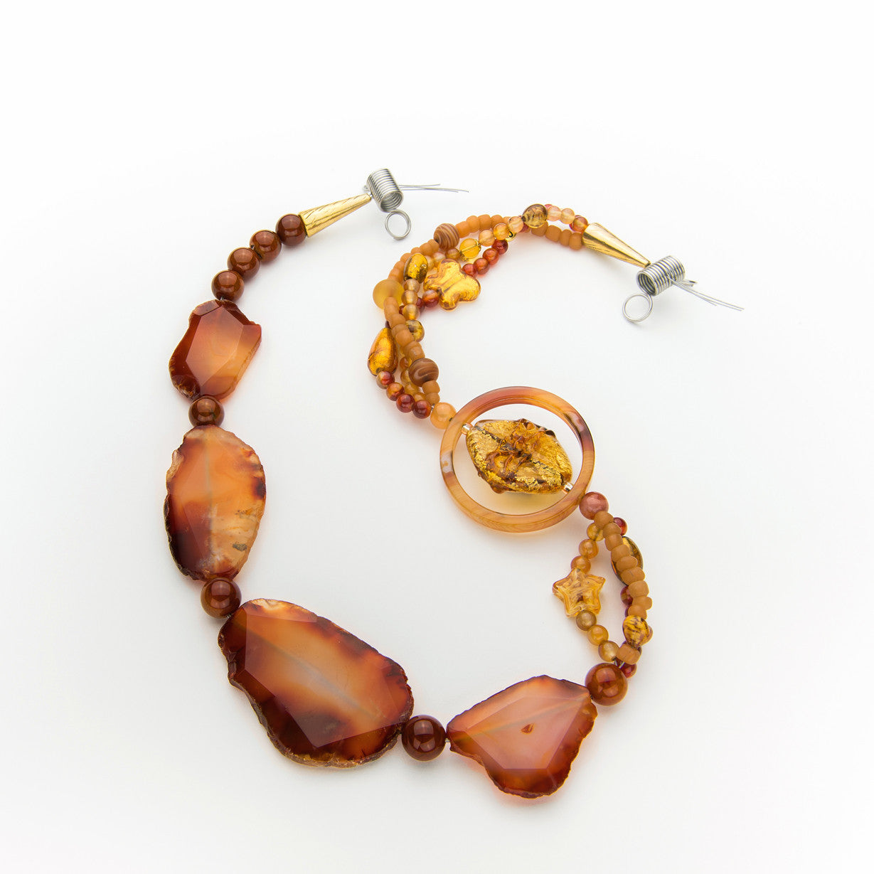 Today we know the region as a vacation destination: Tuscany and Umbria. But back around 600 BC, its inhabitants--the Etruscans--knew a thing or two about the riches that came out of the earth and the golden lifestyle that could follow. In this piece, the four carnelian agate slices of honey, red and warm brown recall the copper they pulled from their mines. Inside an agate ring spins a 35mm Venetian beauty: 24kt gold foil in the crackled Ca' d'Oro style is enveloped in clear Murano glass and decorated with drizzles of topaz-colored glass. Stunning! The three side strands are made up of special Murano glass shapes--a star, little hearts, a butterfly--plus vintage sommerso Venetian beads, agate beads of many colors and, for good measure, earthy African seed beads. All a fitting tribute to Cel, the Etruscan Goddess of the Earth. Wearing this necklace will raise your Earth Goddess status, too!