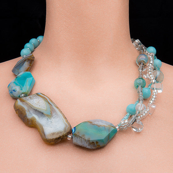 Agate beads the color of Caribbean waters -- four of them -- in the most incredible color variations. Cut straight from rough stone with all its inclusions and imperfections (they say Nature is perfect, but she sends us reminders of the contrary when she makes stones). Faceted amazonite beads complete that side of the necklace. More faceted amazonite (and faceted pale turquoise crystal) make up one of three strands on the other half. Pure clear glass beads and nuggets become the foil to the third strand: pale grey Murano glass wrapped like tiny croissants, studded by a clear glass onion, crystal cube, hollow blown bead ... and an exquisite blown lampwork bead that mimics one of the big agate pieces perfectly. If wearing this necklace doesn't make you feel as if you just stepped off the ship from your latest luxurious vacation cruise, I don't know what will!