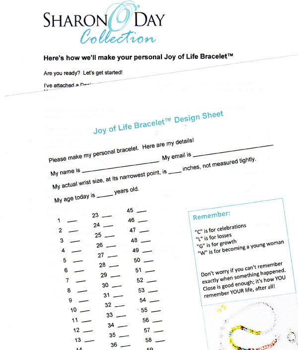 How does this work? You order a Joy of Life Bracelet™ and you enter your best email address on the payment page so we can communicate. You download the Design Sheet from the PDF link down below, you fill it out and email it to me. As soon as I get the form back, I make the bracelet, put it in a special little box and mail it to you. That's it. (Taxes, U.S. shipping and handling are all included in the price.)